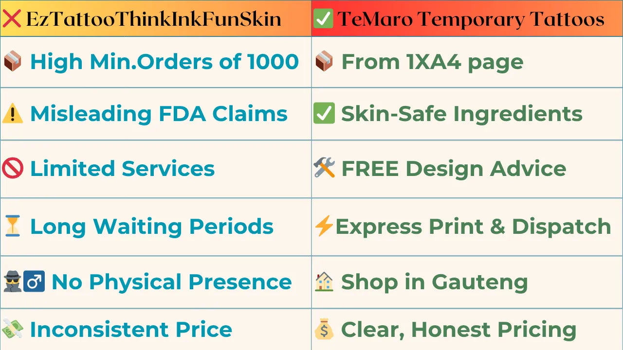 Comparison chart between EzTattooThinkInkFunSkin and TeMaro Temporary Tattoos with pros and cons listed.