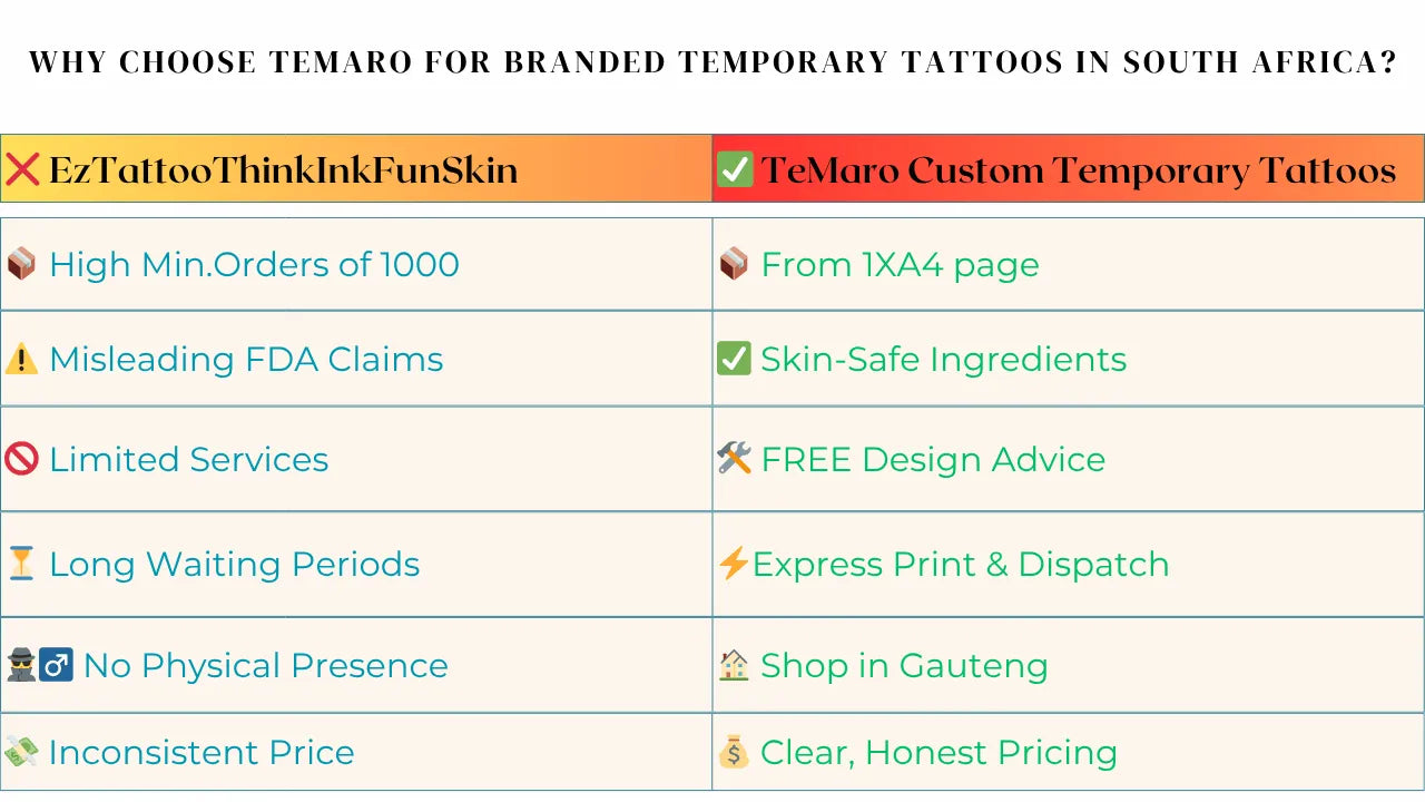 TeMaRo Custom Temporary Tattoos South Africa has the biggest range of temporary tattoos near me, cheapest prices and a professional team of fake tattoo near me experts available to assist you.